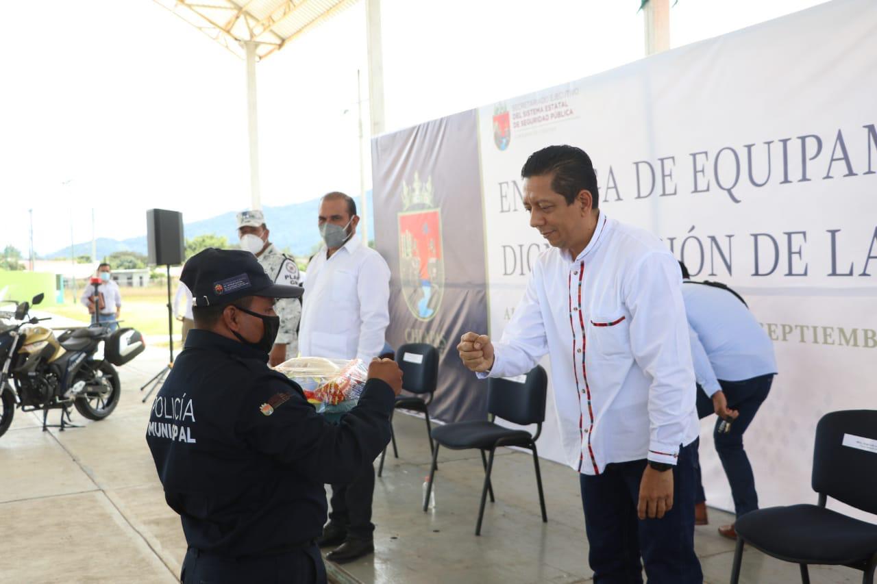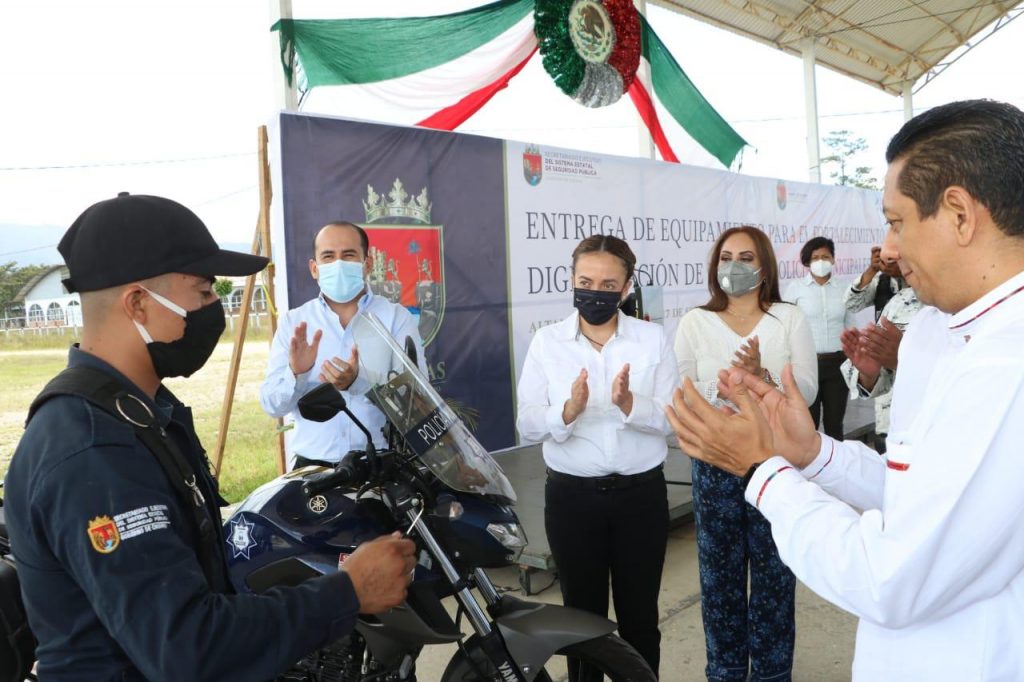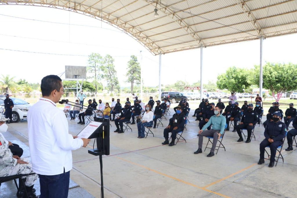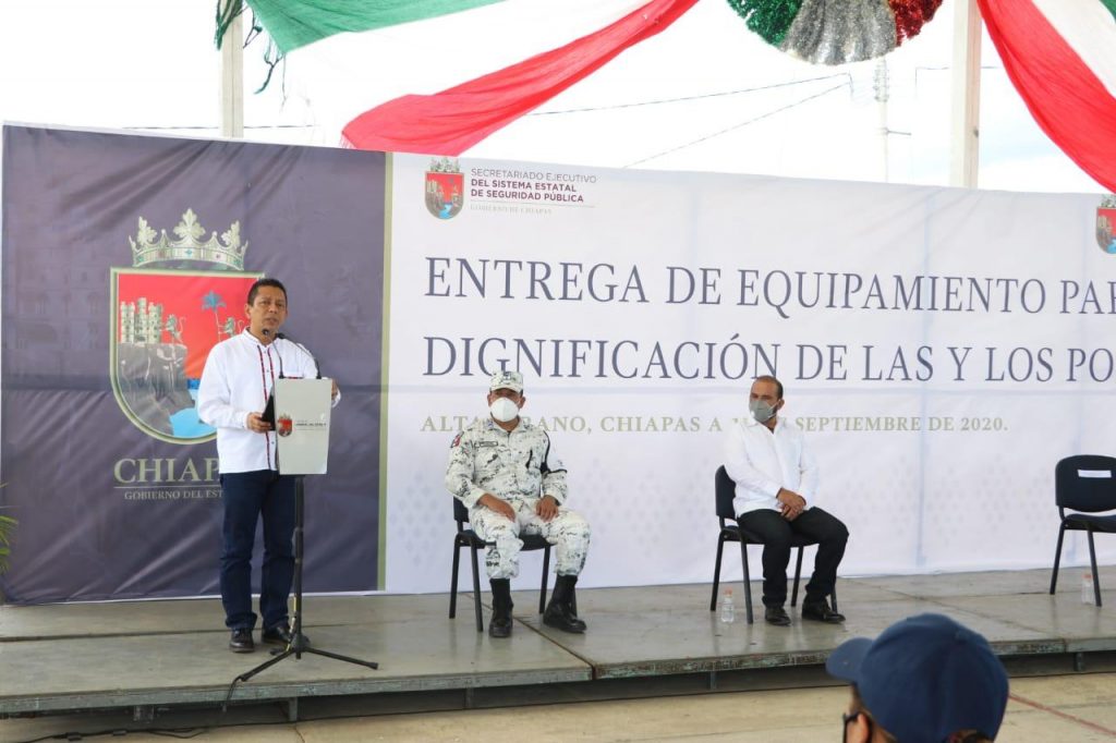 En su intervención, Sergio Alejandro Aguilar Rivera, secretario ejecutivo del Sistema Estatal de Seguridad Pública, detalló que se hizo entrega de una patrulla y una motopatrulla, así como uniformes y equipamiento a las y los policías municipales: “estamos recorriendo todos los municipios para dignificar su loable labor y así cumplir con las instrucciones del gobernador, quien tiene como prioridad la seguridad del pueblo de Chiapas”.