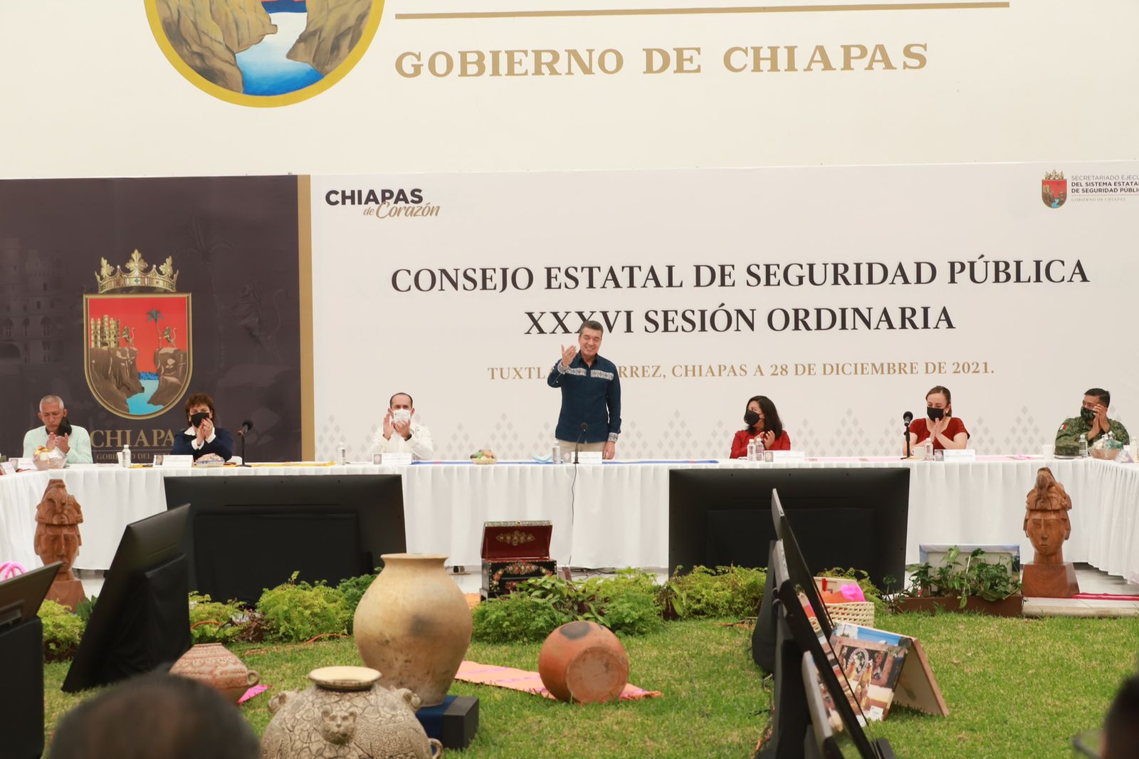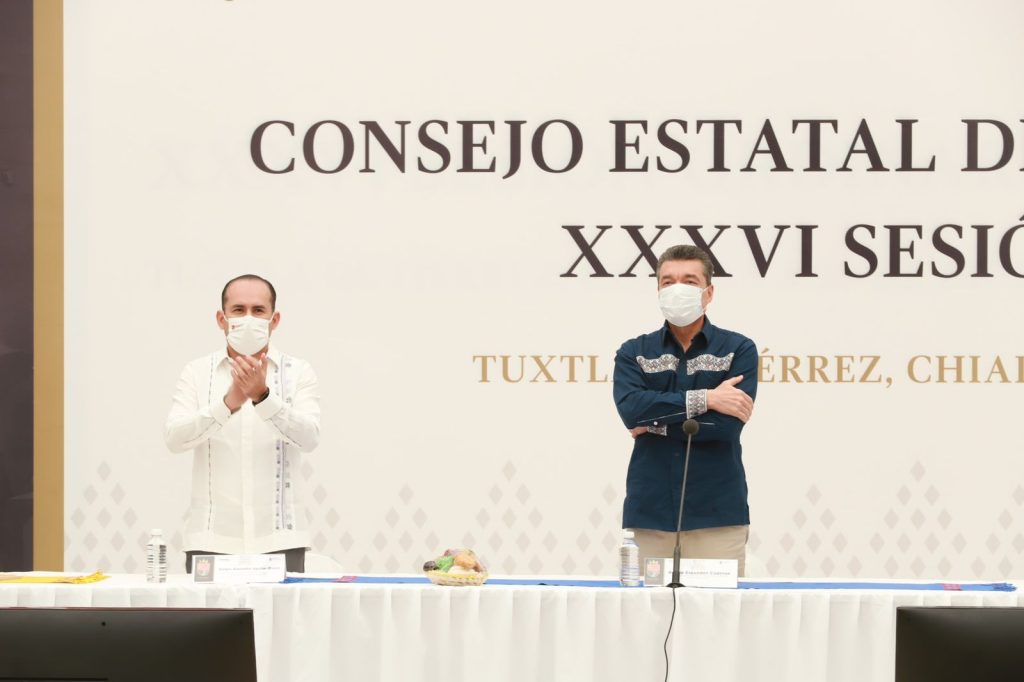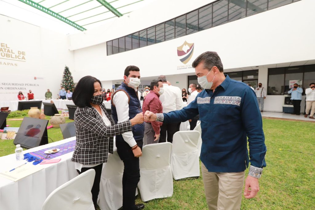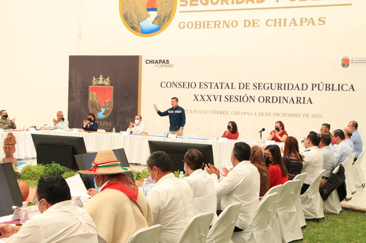 Al encabezar la 36ª Sesión Ordinaria del Consejo Estatal de Seguridad Pública, el gobernador Rutilio Escandón Cadenas reiteró su petición a las presidentas y los presidentes municipales de materializar en sus territorios las tareas a favor de la seguridad que contribuyan a que el pueblo chiapaneco transite en paz y con la certeza de que nadie le arrebatará lo que legítimamente le corresponde, ya que esa es la puerta al progreso.