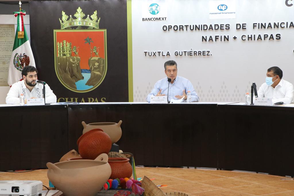 Al encabezar la reunión de trabajo: “Oportunidades de Financiamiento Nafin-Chiapas”, en la que estuvo presente el director general de Nacional Financiera (Nafin) y Banco Nacional de Comercio Exterior (Bancomext), Juan Pablo De Botton, el gobernador Rutilio Escandón Cadenas resaltó el respaldo y los beneficios que Nafin brinda para favorecer al sector de pequeños y medianos empresarios y emprendedores chiapanecos, por el crecimiento de la economía en el estado, ante la pandemia de COVID-19.