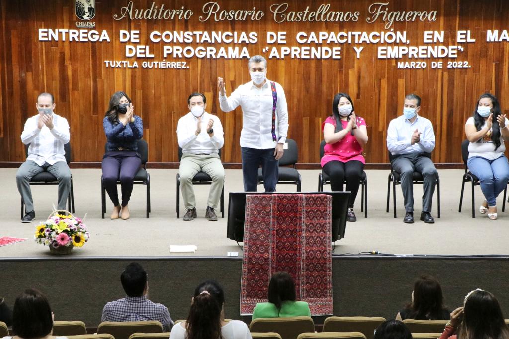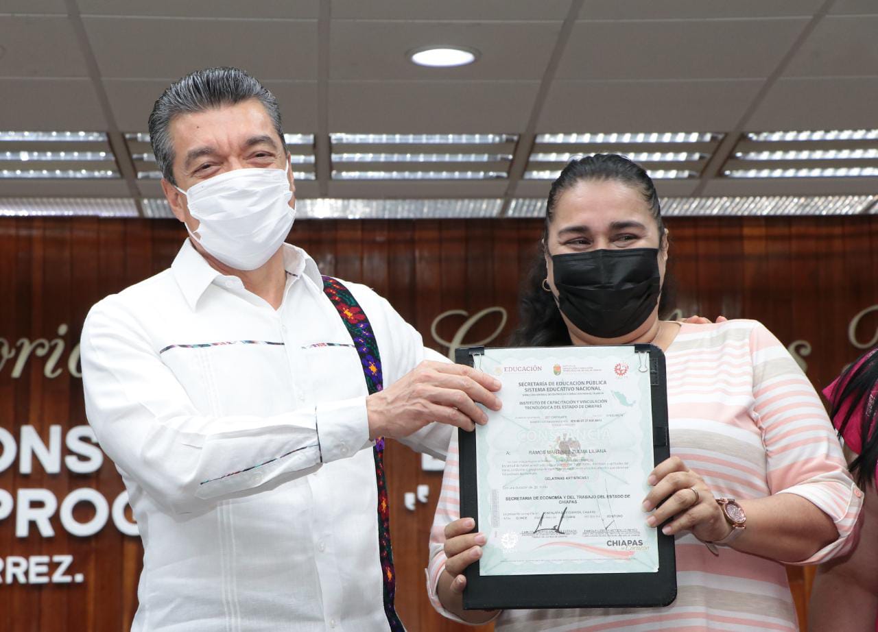 Al hacer entrega de las constancias con validez oficial de la Secretaría de Educación Pública, el gobernador Rutilio Escandón Cadenas apuntó que llevar capacitación a más personas es de gran beneficio porque quienes están aprendiendo tienen la posibilidad de crear sus propios negocios y sumarse a la población económicamente activa de Chiapas, mediante un trabajo digno, que sea de su agrado.