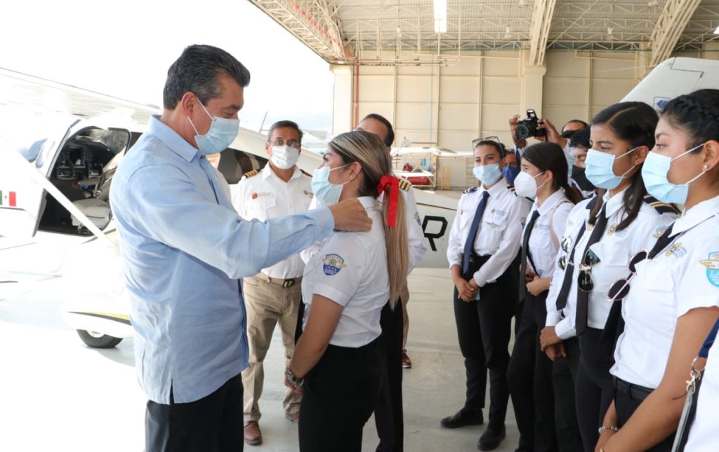 En ese marco, el gobernador Escandón Cadenas impuso charreteras al alumnado de la Licenciatura en Piloto Aviador como símbolo del inicio de su fase de vuelos reales.
