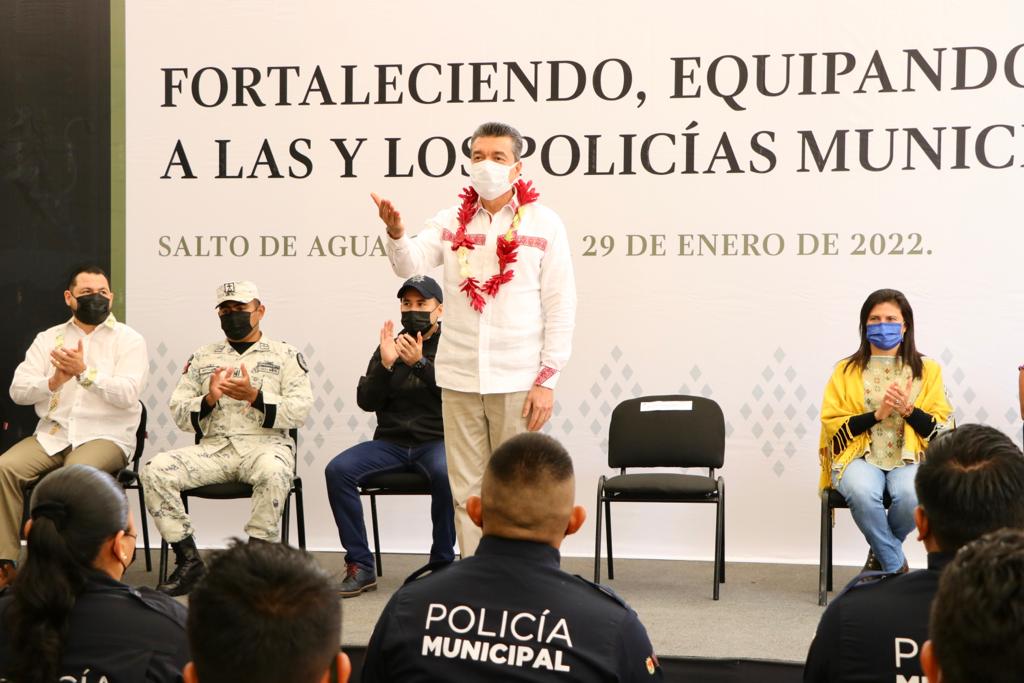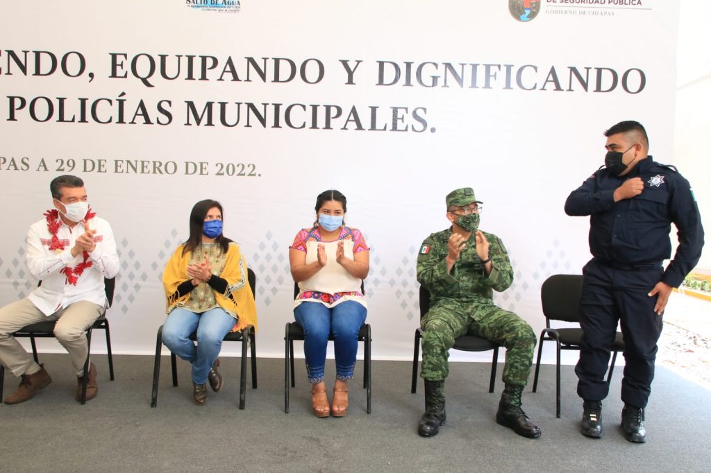 Al encabezar la entrega de una patrulla, 58 motopatrullas, uniformes y equipamiento para dignificar y fortalecer a la policía municipal de Salto de Agua, el gobernador Rutilio Escandón Cadenas destacó que Chiapas va bien en materia de seguridad, gracias a las inversiones en este rubro, a la participación ciudadana y al esfuerzo conjunto entre las autoridades federales, estatales y municipales, quienes trabajan como un solo equipo para cuidar la integridad y el patrimonio de las familias chiapanecas.
