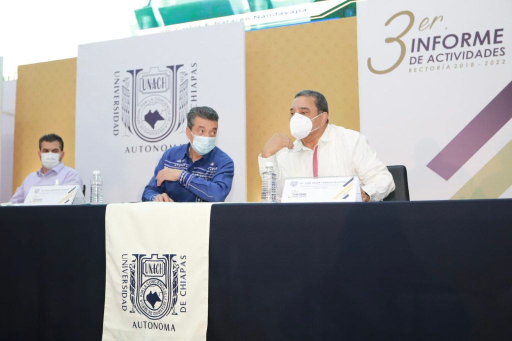 El gobernador Rutilio Escandón Cadenas asistió al Tercer Informe de Actividades del rector de la Universidad Autónoma de Chiapas (Unach), Carlos Natarén Nandayapa, donde sostuvo que su gobierno es aliado de la educación, porque es la base para alcanzar el progreso de Chiapas y de México, y enfatizó que seguirá apoyando a la máxima casa de estudios de la entidad hasta que tenga finanzas sanas y garantizar que el proceso de enseñanza-aprendizaje se realice en espacios educativos dignos y funcionales.