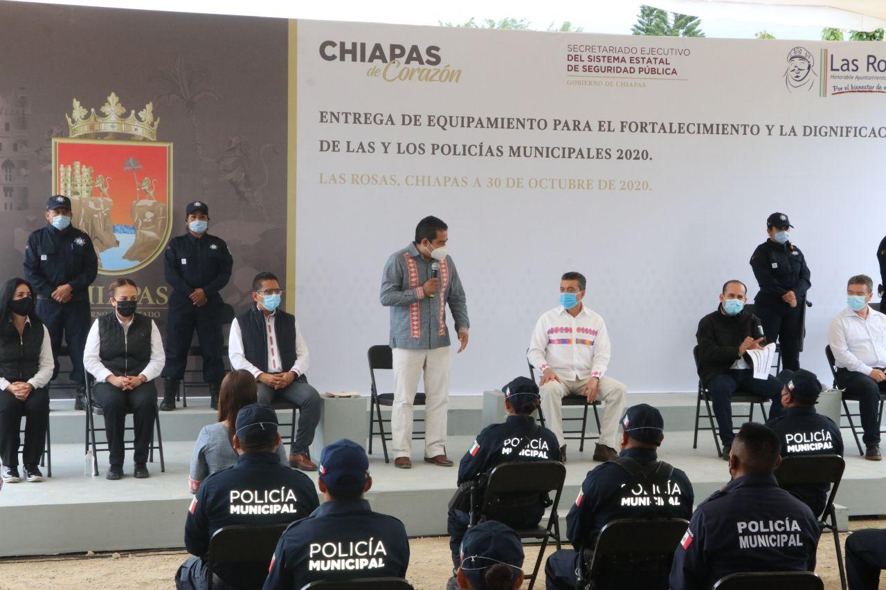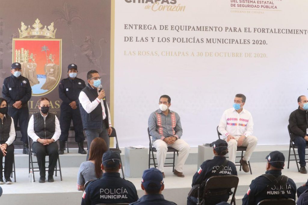 Tuxtla Gutiérrez, Chiapas.- En el marco de la Entrega de Equipamiento y la Dignificación de las y los Policías Municipales de Las Rosas que encabezó el gobernador Rutilio Escandón Cadenas, el fiscal general Jorge Llaven Abarca expresó que hoy en Chiapas hay un gobierno y una Fiscalía General del Estado (FGE) de resultados, que está trabajando de la mano con la sociedad para construir un Chiapas en paz y de progreso.