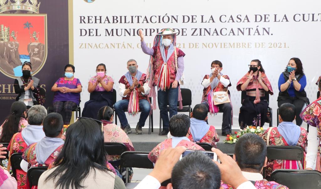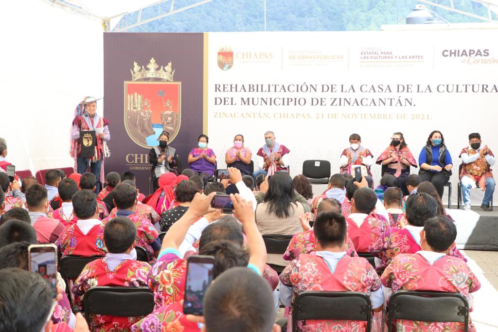Durante la inauguración de la rehabilitación de la Casa de la Cultura de Zinacantán, la cual fue dañada por el sismo de 2017, el gobernador Rutilio Escandón Cadenas celebró que hoy este municipio destacado por sus textiles, flores y música, cuente con un espacio digno y seguro para la expresión artística y cultural, pues, dijo, donde hay cultura siempre habrá progreso.