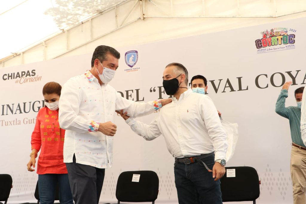El gobernador Rutilio Escandón Cadenas inauguró el Festival Coyatoc 2021, organizado por la Cámara Nacional de Comercio, Servicios y Turismo (Canaco Servytur) y que se lleva a cabo este 23 y 24 de octubre en las instalaciones de la Secretaría de Ganadería, Agricultura y Pesca (SAGyP), donde destacó la importancia de este evento que busca transmitir la historia, expresiones artísticas, cultura y tradición de la región zoque de Chiapas, además de fomentar el comercio local y reactivar la economía.