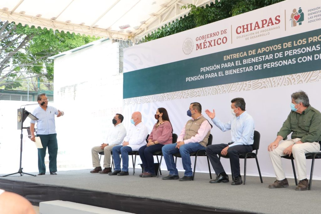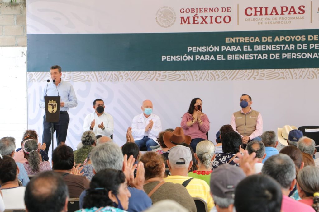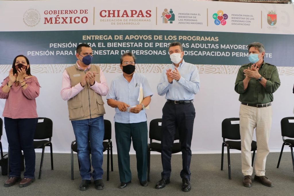 Junto al delegado federal de Programas Integrales de Desarrollo, José Antonio Aguilar Castillejos, el mandatario refrendó su agradecimiento al presidente de la República, Andrés Manuel López Obrador, por el trabajo que realiza para brindar un mayor bienestar al pueblo de Chiapas, al tiempo de señalar que, gracias a su visión, estas pensiones han sido elevadas a rango constitucional y ya están consideradas en el presupuesto de 2022.