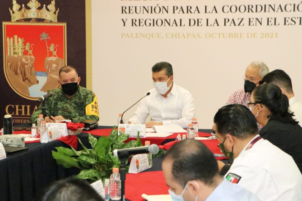 Al encabezar la Mesa de Coordinación Estatal para la Construcción de la Paz y Seguridad, en el municipio de Palenque, el gobernador Rutilio Escandón Cadenas señaló que la meta de este gobierno es que todas y todos estén protegidos contra el COVID-19, por ello, insistió en el llamado a aplicarse la vacuna en alguno de los 146 centros de vacunación activos, clínicas y hospitales asignados, o mediante las brigadas que recorren casas y negocios.