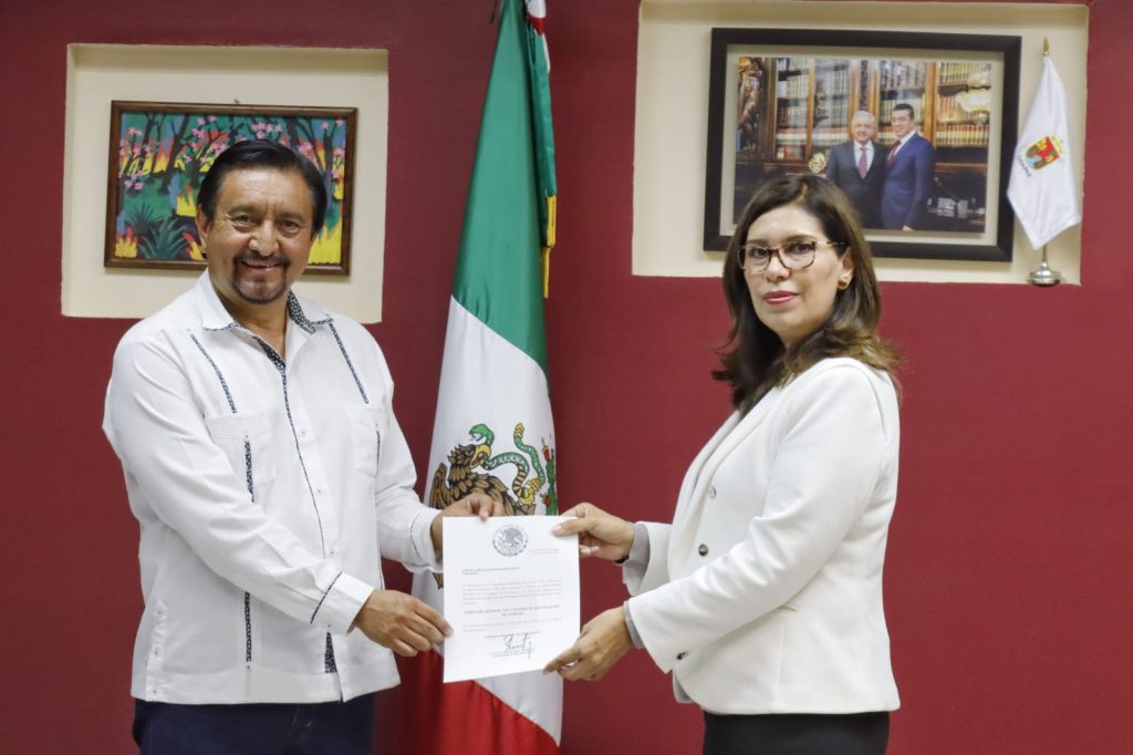 Tuxtla Gutiérrez. – La secretaria de Educación, Rosa Aidé Domínguez Ochoa, entregó este miércoles, en representación del gobernador del Estado, Rutilio Escandón Cadenas, el nombramiento a Jorge Luis Escandón Hernández como nuevo director general del Colegio de Bachilleres de Chiapas (Cobach), en sustitución de Nancy Leticia Hernández Reyes.