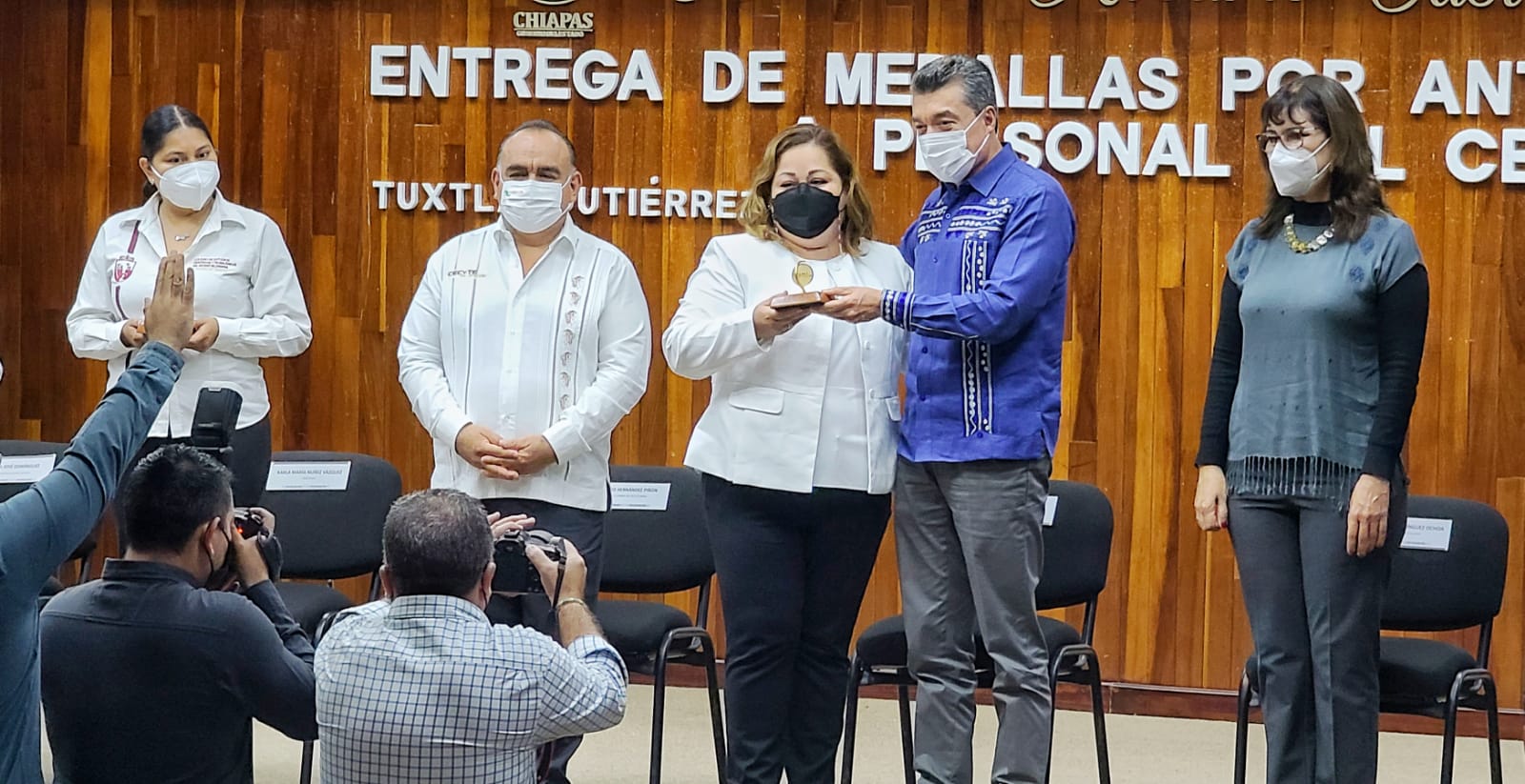 En reconocimiento a las y los trabajadores del Colegio de Estudios Científicos y Tecnológicos del Estado de Chiapas (Cecyte Chiapas) con más años de servicio a favor de la educación, se entregaron 110 medallas por antigüedad; y como un acto de justicia laboral se benefició con el otorgamiento de escalafones a personal administrativo.