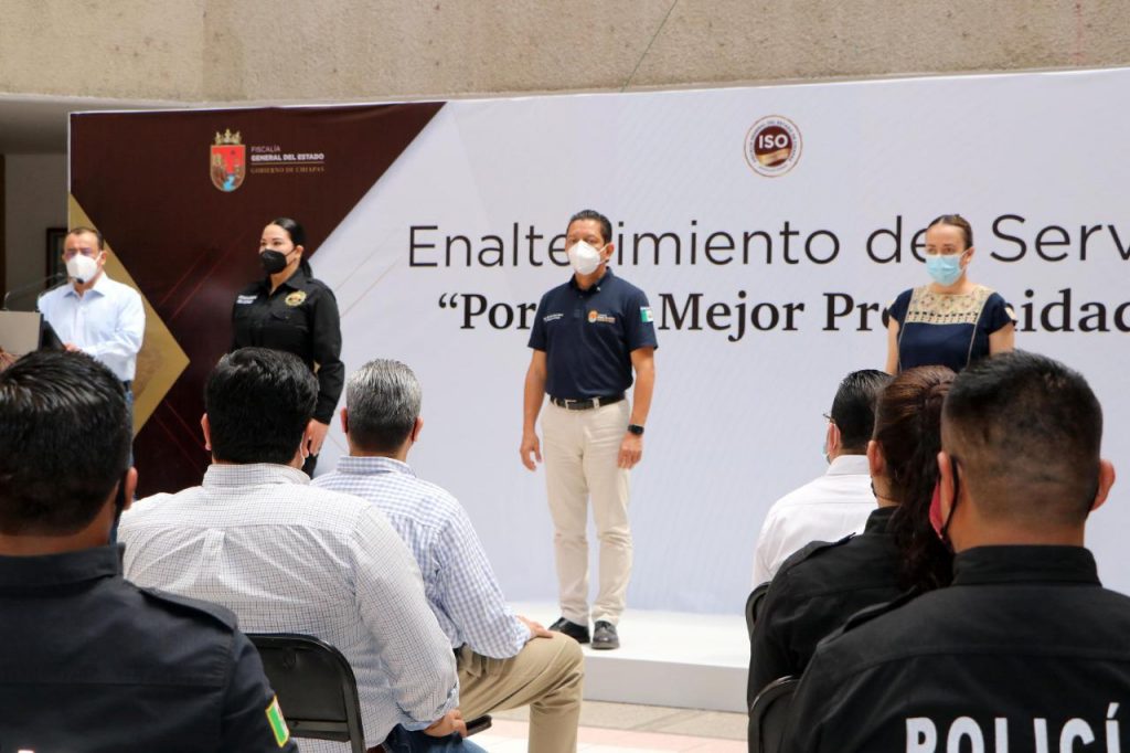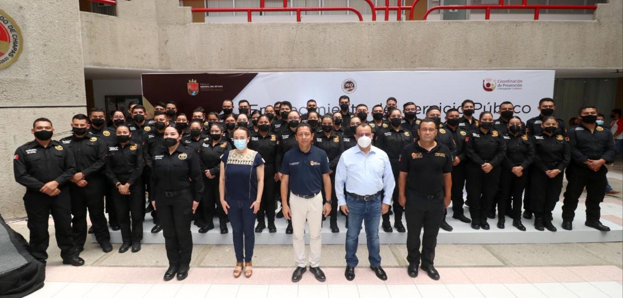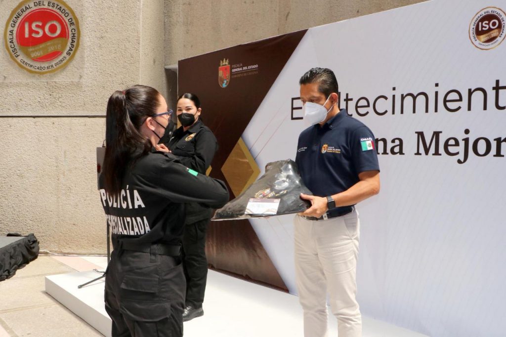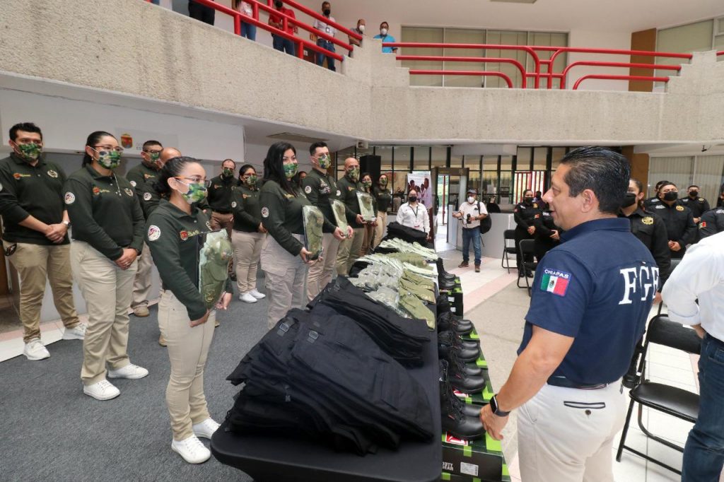 Acompañado por Jordán de Jesús Alegría Orantes, fiscal de Coordinación; Gabriela del Socorro Zepeda Soto, secretaria de Seguridad y Protección Ciudadana; y Yaneth Herrera Bonilla, directora general de la Policía Especializada; Llaven Abarca expresó que hoy en Chiapas hay una Fiscalía del Estado comprometida con dignificar y fortalecer las capacidades de las y los servidores públicos que tienen la encomienda de velar por la seguridad y la justicia de las y los chiapanecos.