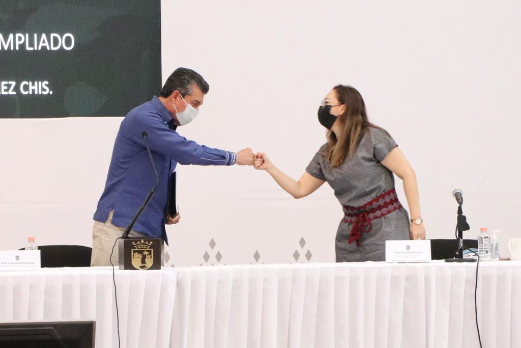 Respecto a la pandemia, reconoció que gracias a que el pueblo se cuida y es resiliente, al trabajo profesional y humano del personal de salud, y a la labor de las y los integrantes del Consejo de Seguridad en Salud, Chiapas destaca a nivel nacional con la tasa más baja en contagios y defunciones, y con la mayor desocupación hospitalaria, al tiempo de reiterar el llamado a la población a vacunarse y mantener la recomendaciones preventivas, especialmente de sana distancia e higiene ante el COVID-19.