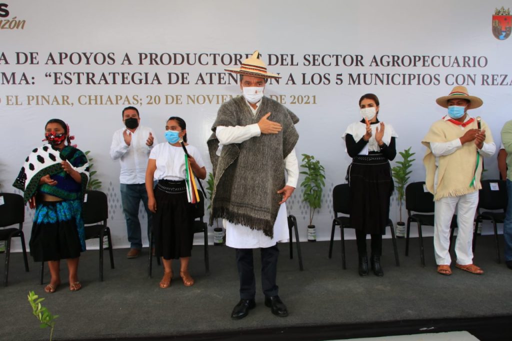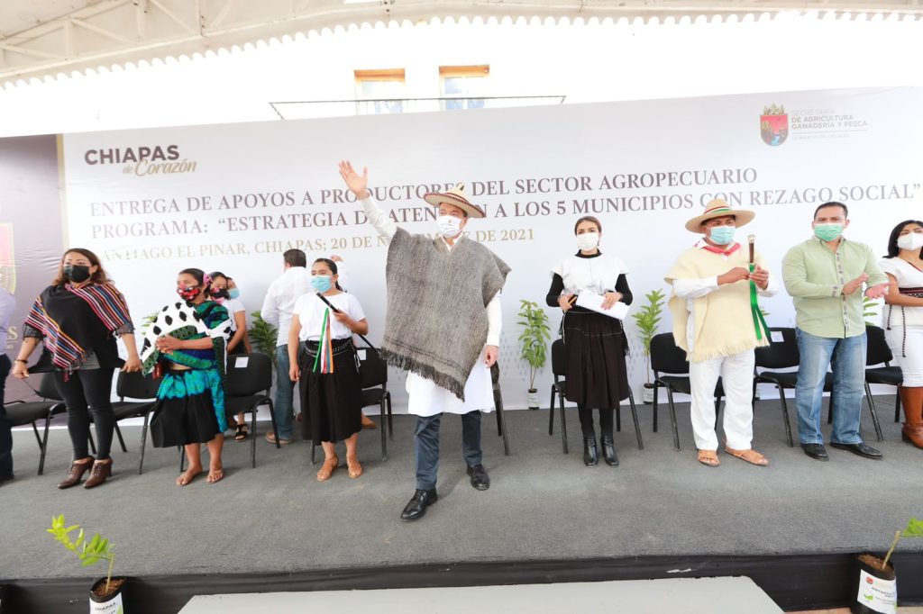 El gobernador Rutilio Escandón Cadenas encabezó la entrega de apoyos agrícolas y pecuarios del Programa Estrategia de Atención a los Cinco Municipios con Mayor Rezago Social, que en esta ocasión benefició a habitantes de Santiago El Pinar, Mitontic y Chanal, donde destacó que este gobierno prioriza la atención de las necesidades más sensibles de los pueblos indígenas, a fin de contribuir al bienestar, la seguridad alimentaria y el crecimiento del índice de desarrollo humano.