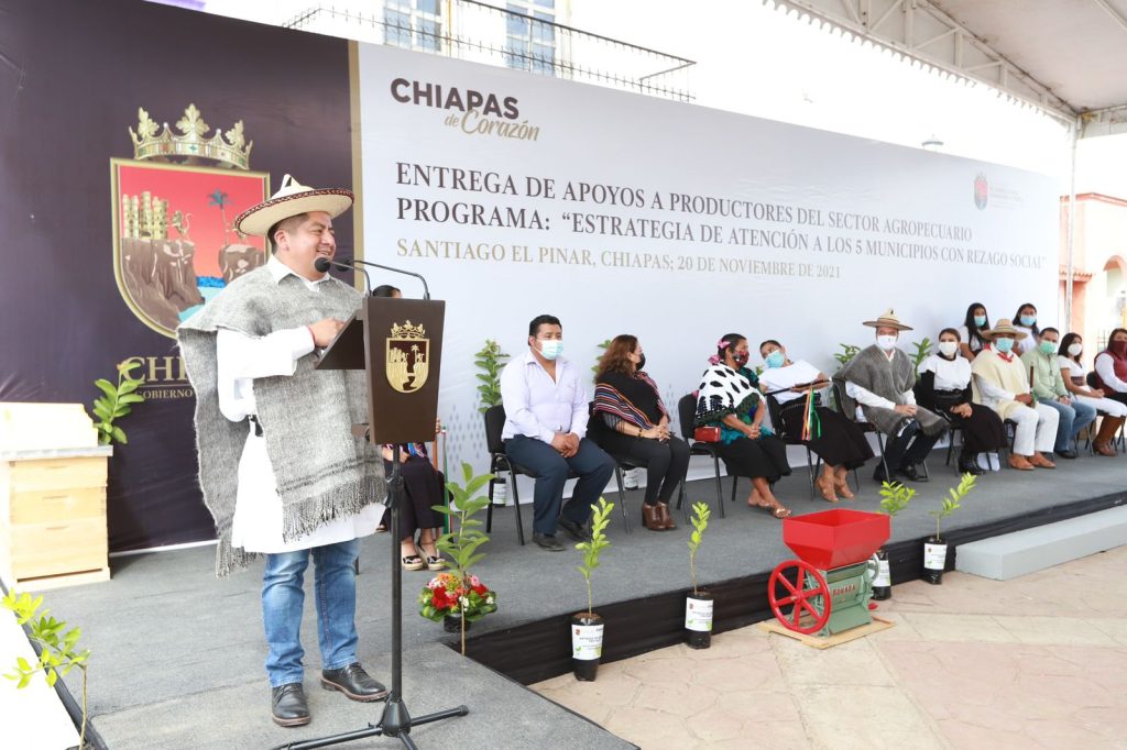 En su intervención, el secretario para el Desarrollo Sustentable de los Pueblos Indígenas, Emilio Ramón Ramírez Guzmán señaló que la entrega de estos insumos forma parte de la instrucción del gobernador Rutilio Escandón Cadenas de atender de manera integral a todos los pueblos indígenas, con el propósito de llevar bienestar, combatir el rezago social y reactivar la productividad del campo.