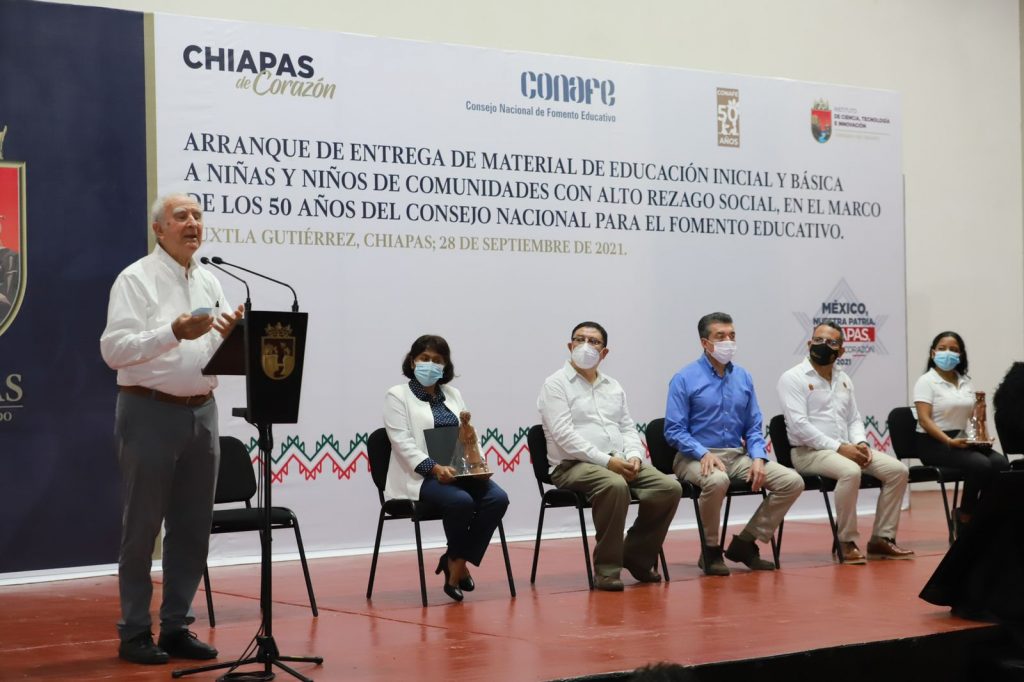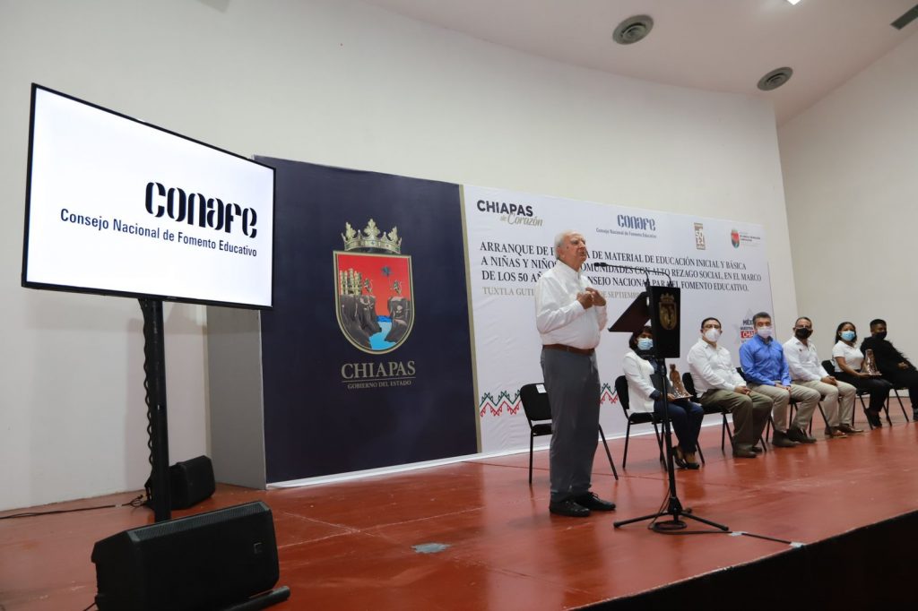 El gobernador Rutilio Escandón Cadenas y el director general del Consejo Nacional para el Fomento Educativo (Conafe), Gabriel Cámara y Cervera, encabezaron el arranque de entrega de más de dos mil paquetes de material de educación inicial y básica a niñas y niños de comunidades con alto rezago social, en el marco de los 50 años del Conafe.