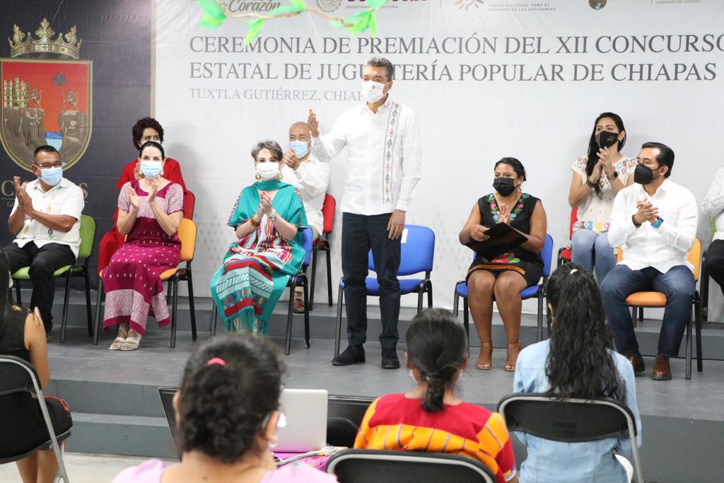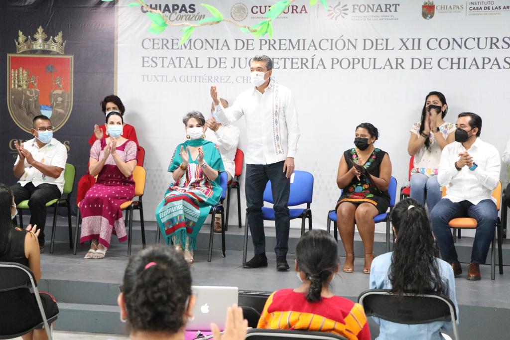 Al encabezar la ceremonia de Premiación de las ganadoras y ganadores del XII Concurso Estatal de Juguetería Popular de Chiapas 2022, el gobernador Rutilio Escandón Cadenas sostuvo que es fundamental fortalecer este tipo de acciones, pues además de impulsar y fomentar la creatividad de las artesanas y los artesanos, se contribuye a la preservación de la riqueza cultural e histórica que enaltece a México ante el mundo.