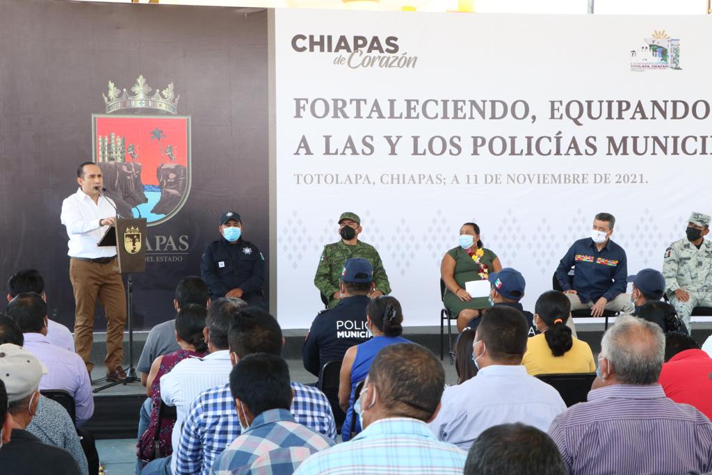 Durante la entrega de patrullas, uniformes y equipos a la Policía Municipal de Totolapa, el gobernador Rutilio Escandón Cadenas señaló que ante el abandono en que tenían a las y los policías municipales, en esta administración se invierte con el objetivo de que estén preparados y certificados para desempeñarse de mejor manera a favor de la seguridad.