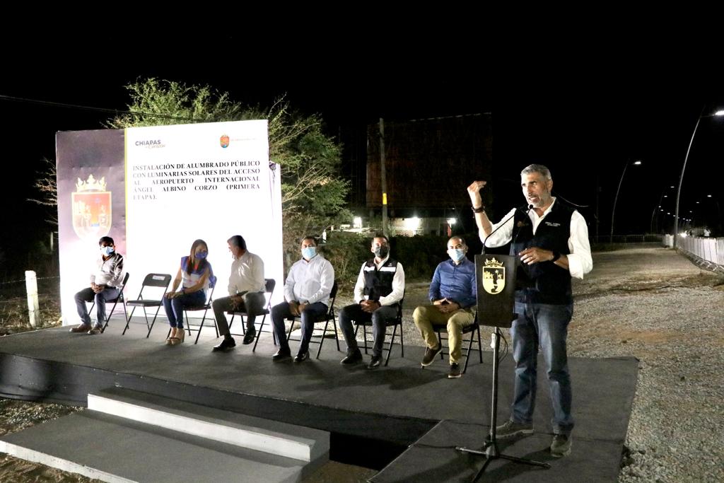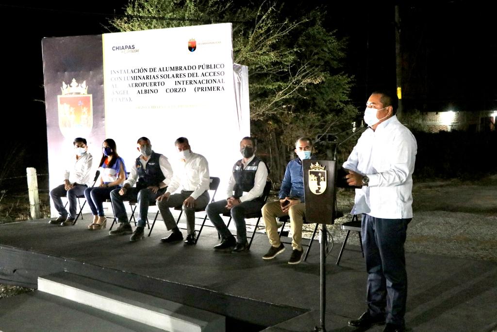 Al inaugurar la instalación del alumbrado público con luminarias solares del camino de acceso al Aeropuerto Internacional “Ángel Albino Corzo”, el gobernador Rutilio Escandón Cadenas subrayó que con la ejecución de esta obra, en la que se invirtieron más de 7.9 millones de pesos, se contribuye a la modernización de la imagen urbana de Chiapas, fortaleciendo un entorno digno y seguro para el tránsito de conductores particulares y de servicio público, así como para habitantes de diversas localidades vecinas.