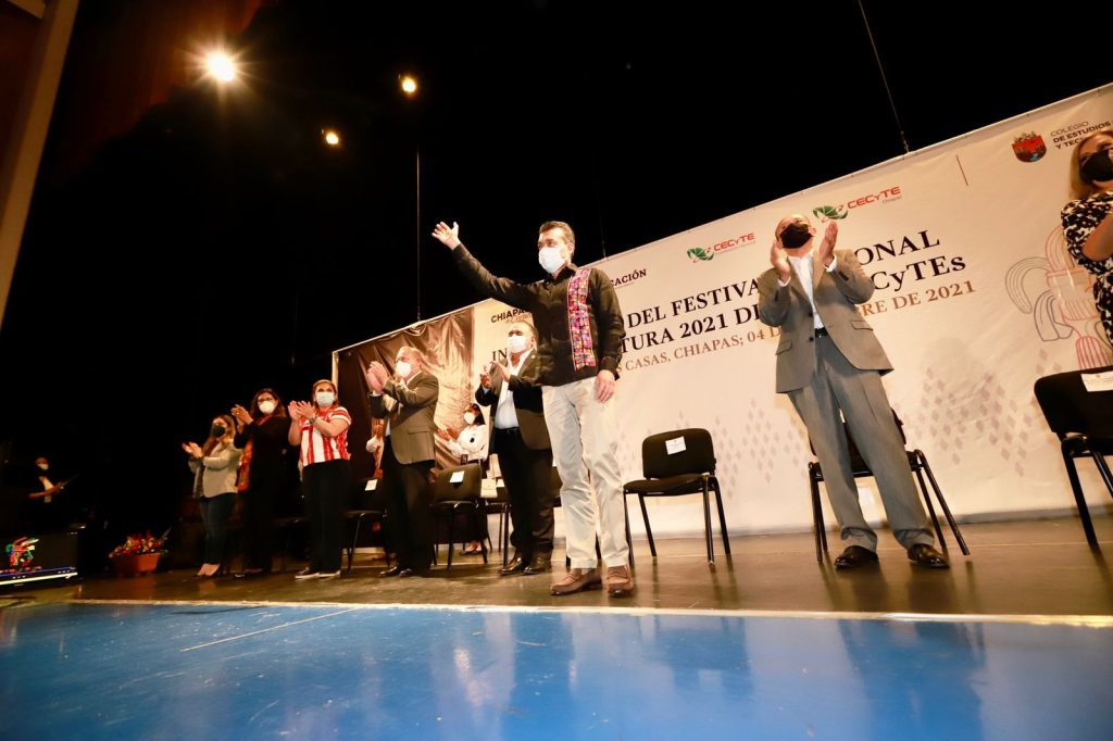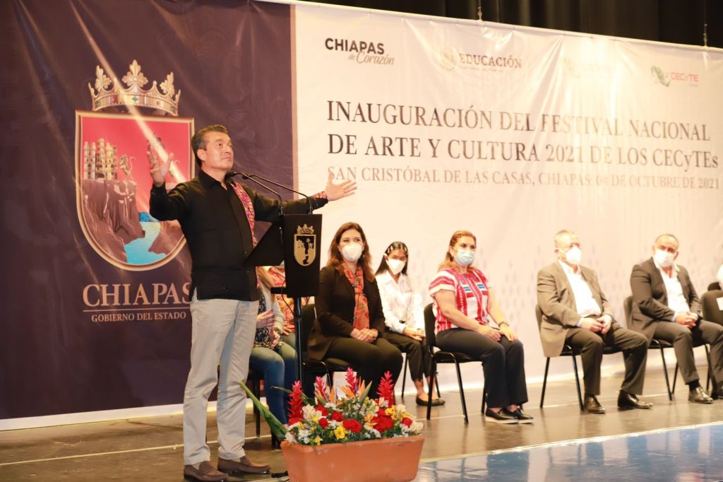 Durante la inauguración del Festival Nacional de Arte y Cultura de los Colegios de Estudios Científicos y Tecnológicos (Cecyte) 2021, en el municipio de San Cristóbal de Las Casas, el gobernador Rutilio Escandón Cadenas sostuvo que la riqueza del mosaico cultural y artístico enaltece a Chiapas y México ante el mundo, por ello es fundamental impulsar este tipo de acciones para apoyar y fortalecer el talento y la capacidad de las presentes y futuras generaciones de jóvenes.