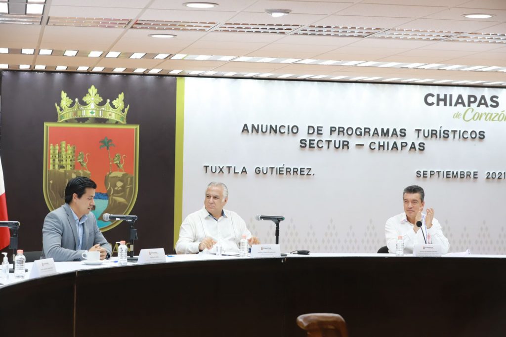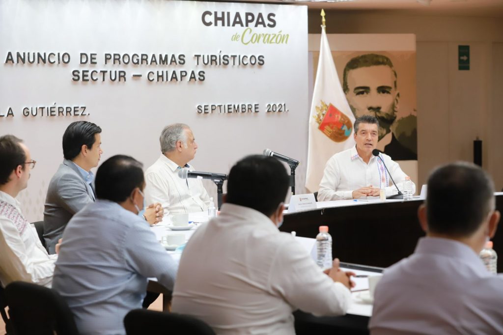 Durante el Anuncio de Programas Turísticos en el Estado de Chiapas encabezado por el secretario de Turismo federal, Miguel Torruco Marqués, el gobernador Rutilio Escandón Cadenas reconoció el respaldo del gobierno del presidente Andrés Manuel López Obrador para impulsar al turismo en la entidad, ya que mediante estas acciones se generará una mayor derrama económica y se mitigarán las grandes necesidades que tiene Chiapas.