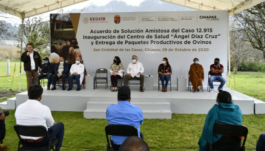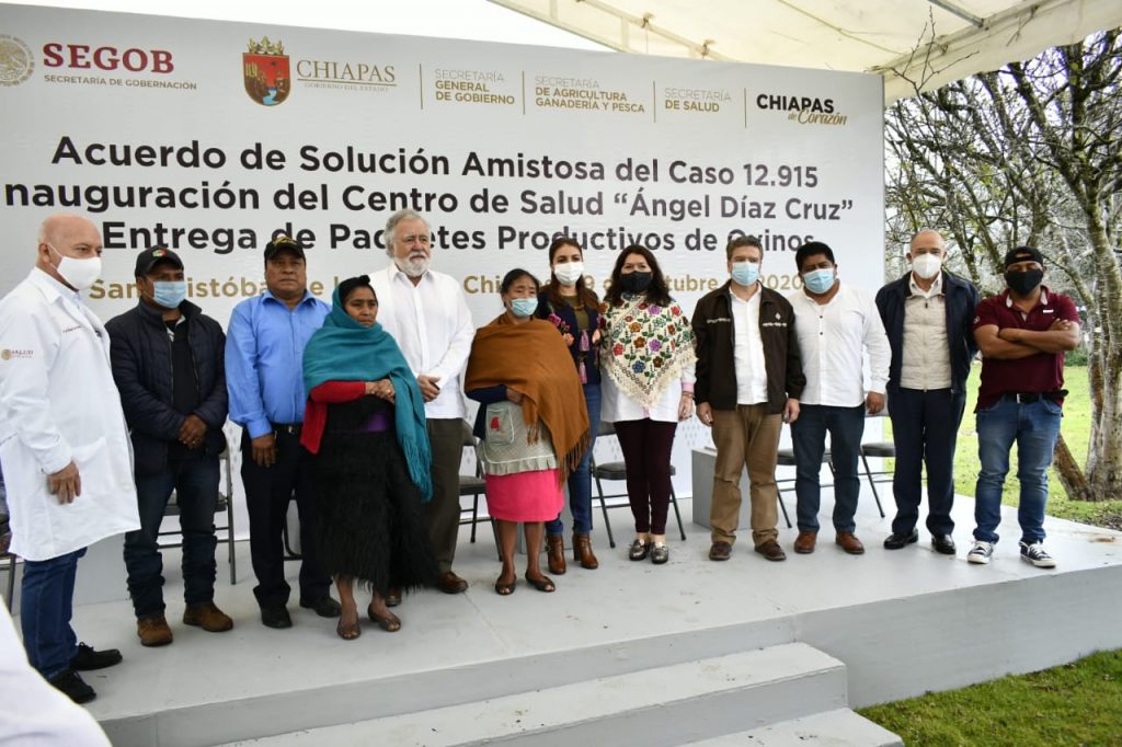 Como parte de este cumplimiento y acuerdo de solución Amistosa, se inauguró y develó la placa del Centro de Salud “Ángel Díaz Cruz”, y se entregaron proyectos productivos a las víctimas.