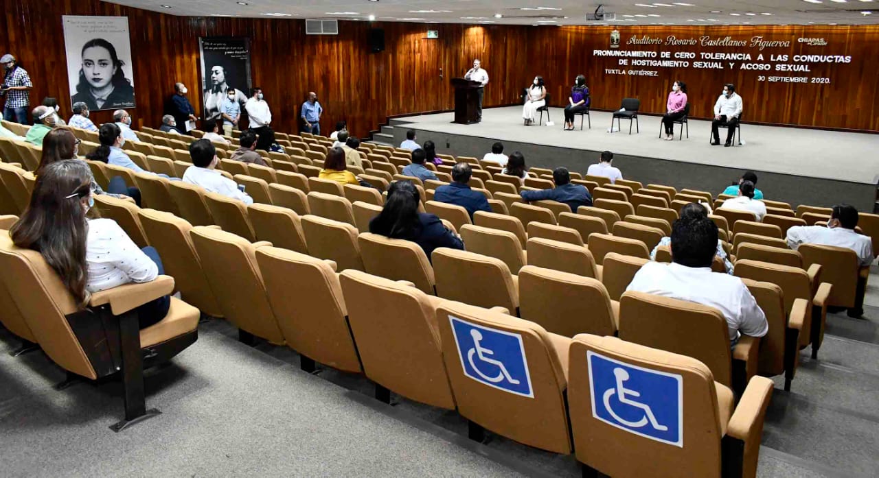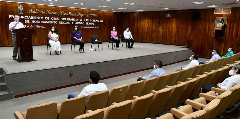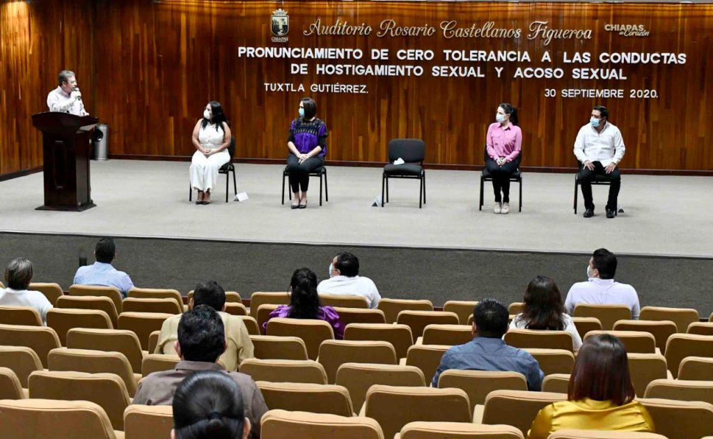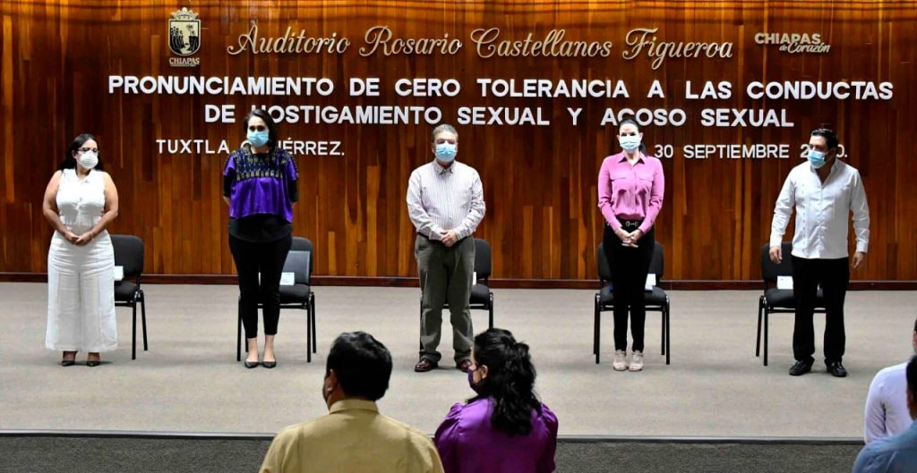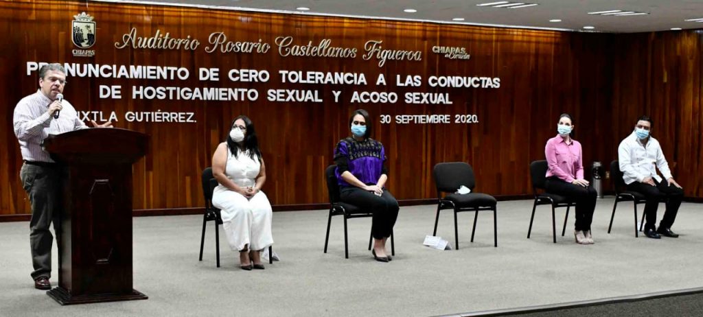 Tuxtla Gutiérrez, Chiapas; 04 de octubre de 2020.- En la construcción de una nueva ética del servicio público basado en la honestidad y con el propósito de ser referente de los más altos valores en el trabajo, con inclusión, igualdad y respeto, el secretario general de Gobierno, Ismael Brito, realizó el “Pronunciamiento de Cero Tolerancia a las Conductas de Hostigamiento y Acoso Sexual”, así como a toda forma de violencia contra las mujeres o cualquier acto que atente contra la dignidad e integridad de las personas.