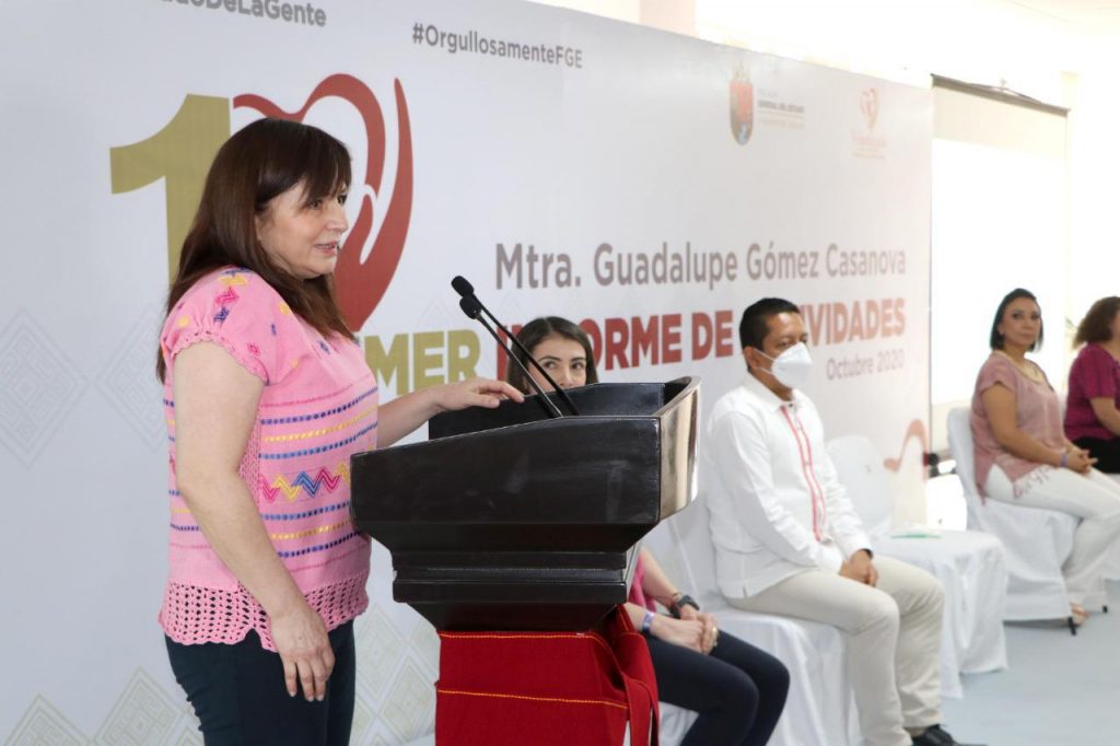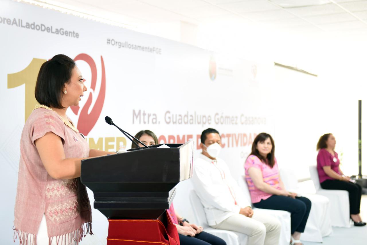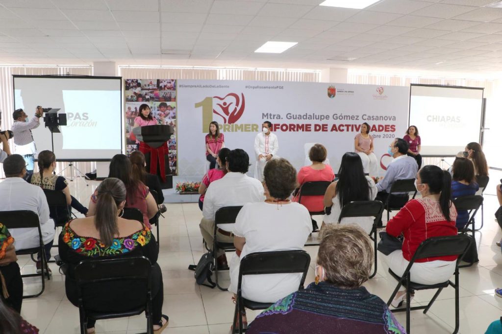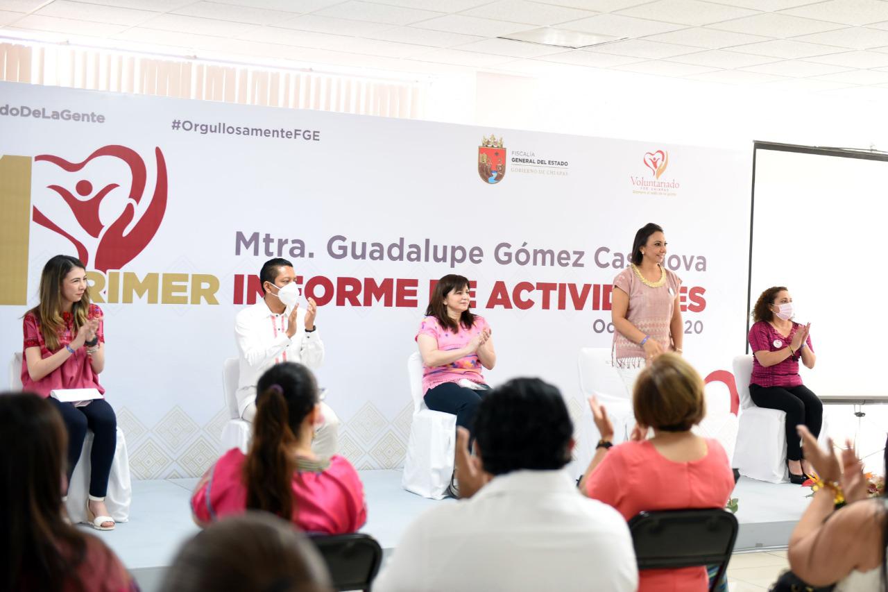 Tuxtla Gutiérrez, Chiapas.- Acompañada por Rosalinda López Hernández, presidenta del Voluntariado de Corazón y del fiscal general Jorge Llaven Abarca, la presidenta del Voluntariado FGE “Siempre al lado de la gente”, Guadalupe Gómez Casanova, presentó su Primer Informe de Actividades, en el que destacó las acciones solidarias que ha realizado esta institución con el firme propósito de procurar el desarrollo de grupos en situación de vulnerabilidad, privilegiando a mujeres, niñas y niños víctimas del delito, y además refrendó su compromiso para continuar trabajando de la mano con autoridades y sociedad civil para la construcción de un Chiapas más justo, solidario y equitativo.