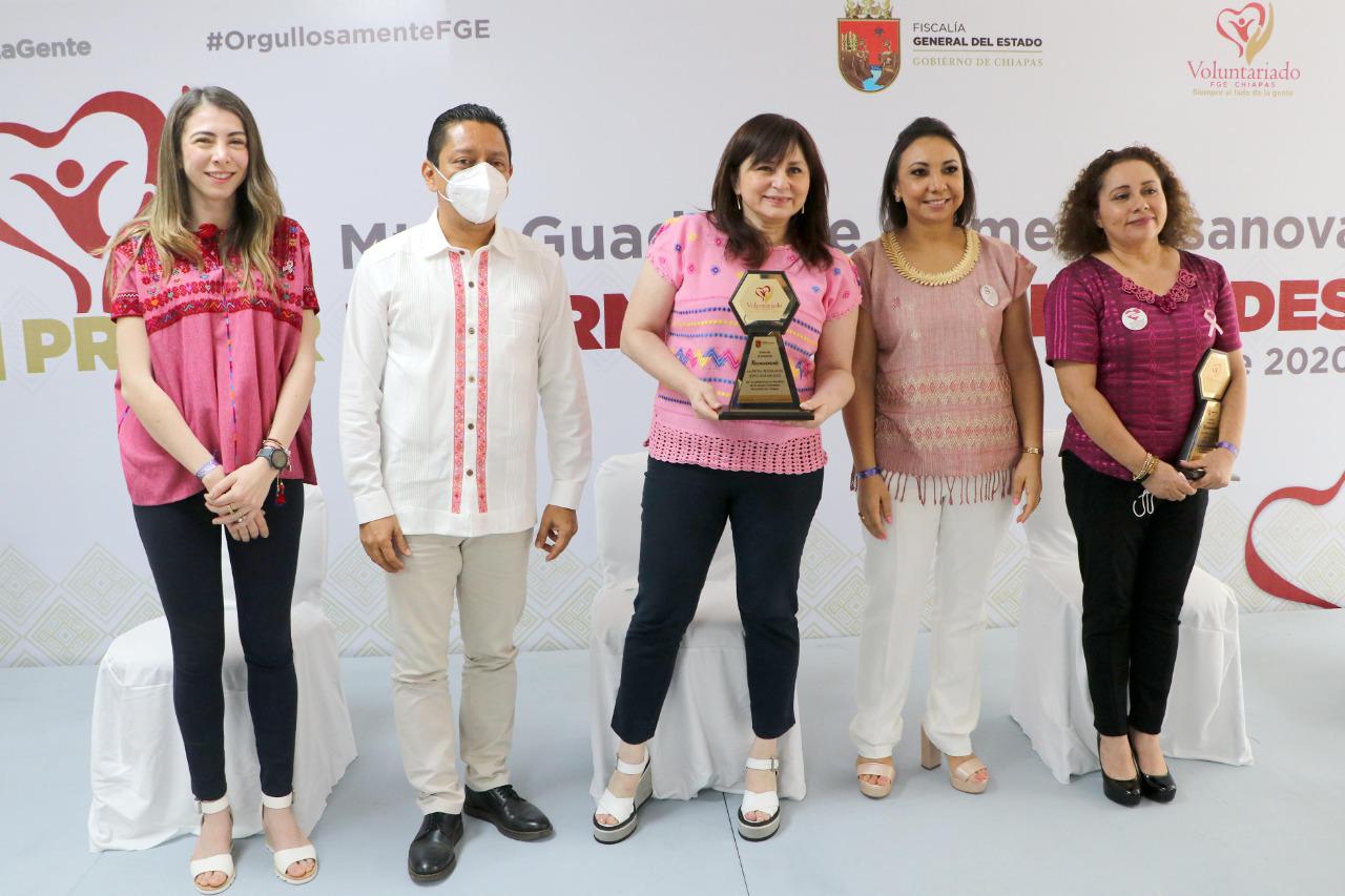 En este importante evento, al que asistieron Gabriela del Socorro Zepeda Soto, secretaria de Seguridad y Protección Ciudadana; Zaynia Andrea Gil Vázquez, secretaria de Agricultura, Ganadería y Pesca; y María Esther García, secretaria técnica del gobernador Rutilio Escandón Cadenas; se entregaron reconocimientos a benefactores del Voluntariado FGE: Magali Chávez Guillén, de Incubadora Villaflores; Consuelo López Rodas, voluntaria y benefactora de medicamentos; Léster David Duportay Tejeda, donación de brigadas médicas; Alondra Llaven Rodríguez, servicio gratuito de limpieza bucal a colaboradores de la FGE; Pamela Escobar Mora, donación de brigadas de salud bucal; Hugo Porras Pérez, empresario; y Beatriz Figueroa Córdova, presidenta de la Asociación Mexicana de Mujeres Jefas de Empresas (AMMJE).