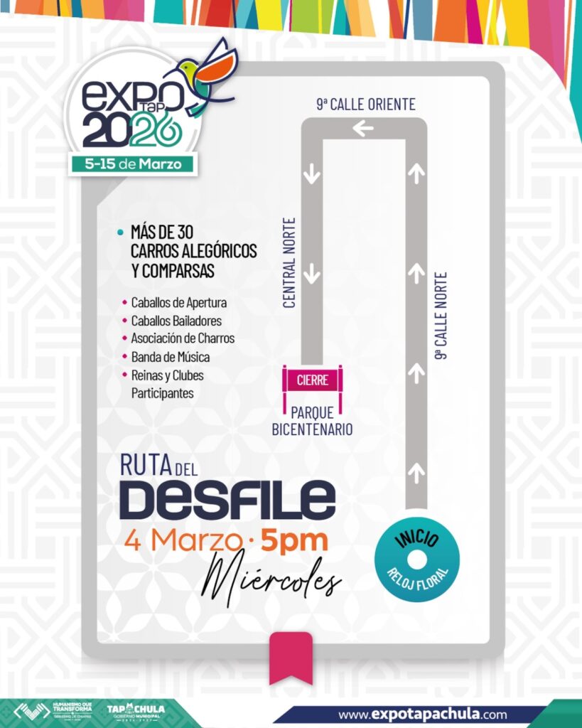 El presidente del Patronato de la EFT 2026, Emilio Barrios Solano, invitó a toda la población a disfrutar del desfile tradicional de la feria ganadera, agrícola, comercial y empresarial que se desarrollará del 5 al 15 de marzo y en el que participará la Reina Electa de la 64 edición, Maylén Alvarado Balcázar, inicia este miércoles con el desfile que arrancará del Reloj Floral del Par Vial de la 9ª avenida Sur, hasta llegar a la 9ª. avenida Oriente en el Centro de Convivencia para llegar a la Avenida Central Norte y culminar en el parque Bicentenario.
